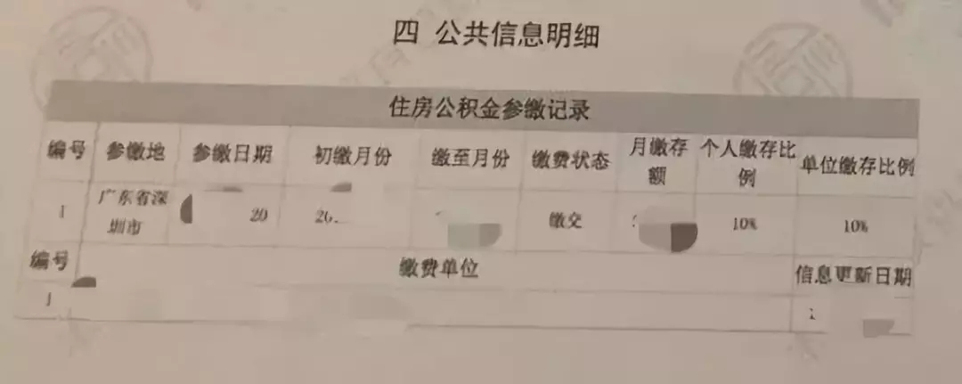 04公共信息明细 公共信息明细里面主要显示你的住房公积金的缴纳情况,包括缴纳地区、缴纳公司、时间、缴纳金额和缴纳比例。